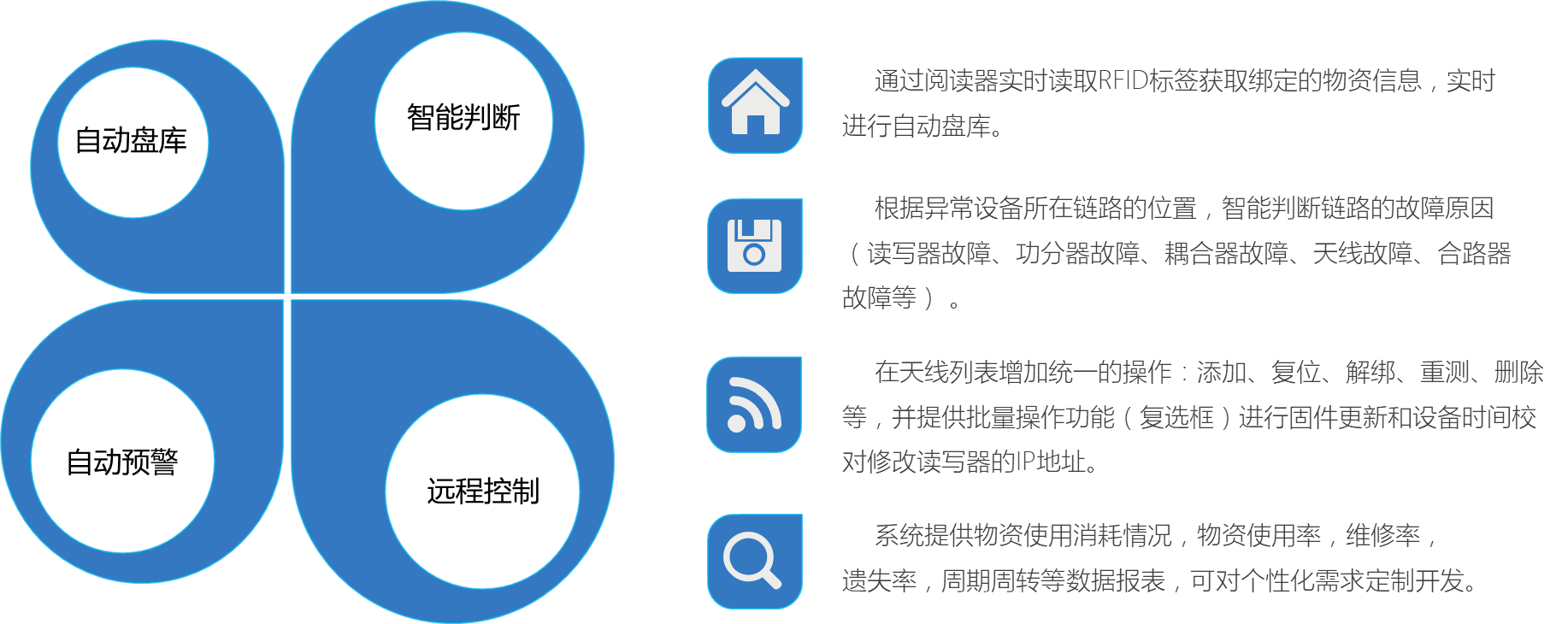 自動(dòng)盤庫(kù):通過(guò)RFID標(biāo)簽信息讀取,自動(dòng)識(shí)別和盤點(diǎn)室分資產(chǎn),實(shí)現(xiàn)室分資產(chǎn)無(wú)人化盤點(diǎn),提高資產(chǎn)盤點(diǎn)效率。