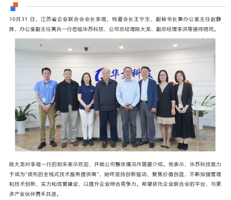 10月31 日,江蘇省企業(yè)聯(lián)合會(huì)會(huì)長(zhǎng)李琨、特邀會(huì)長(zhǎng)王寧生、副秘書長(zhǎng)兼辦公室主任趙靜姝、辦公室副主任黃兵一行蒞臨華蘇科技 ,