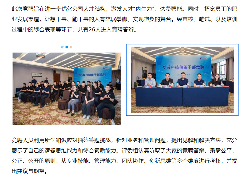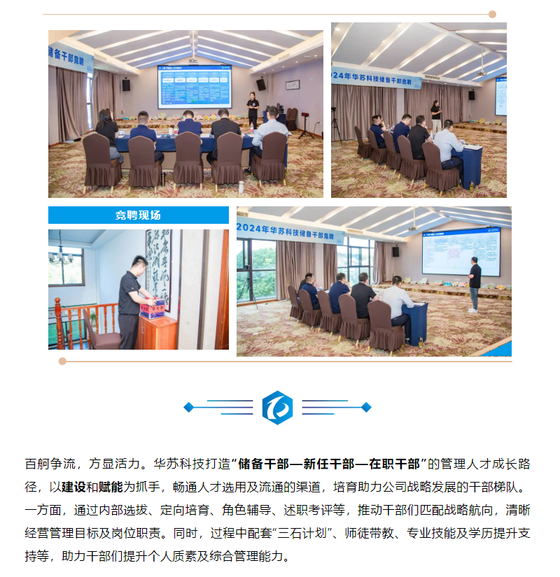 近日,華蘇科技 開展了2024年儲(chǔ)備干部內(nèi)部競聘。本次競聘設(shè)置專業(yè)評委組,由公司副總經(jīng)理蘇亮、孟維、楊小蕾、李洪組成,