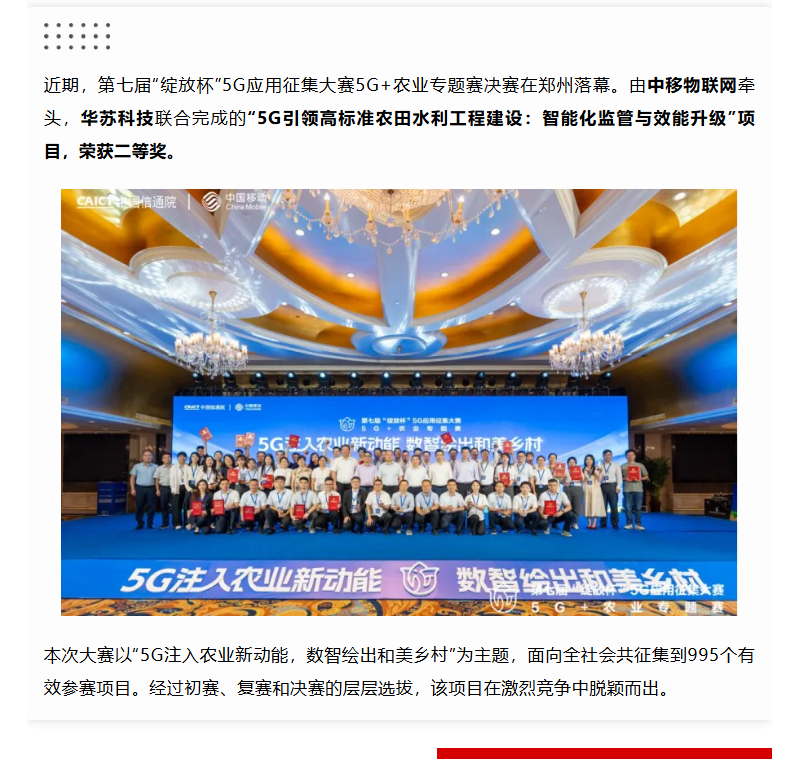 合力創佳績,華蘇科技榮獲第七屆“綻放杯”5G應用征集大賽5G+農業專題賽二等獎