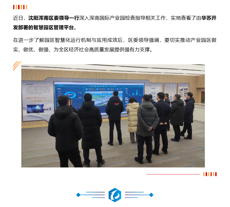 近日,沈陽渾南區(qū)委領(lǐng)導(dǎo)一行深入渾南國際產(chǎn)業(yè)園檢查指導(dǎo)相關(guān)工作,實(shí)地查看了由華蘇開發(fā)部署的智慧園區(qū)管理平臺。